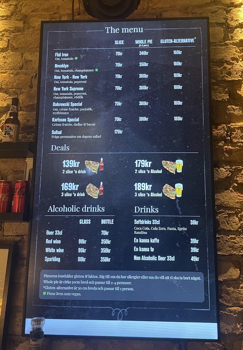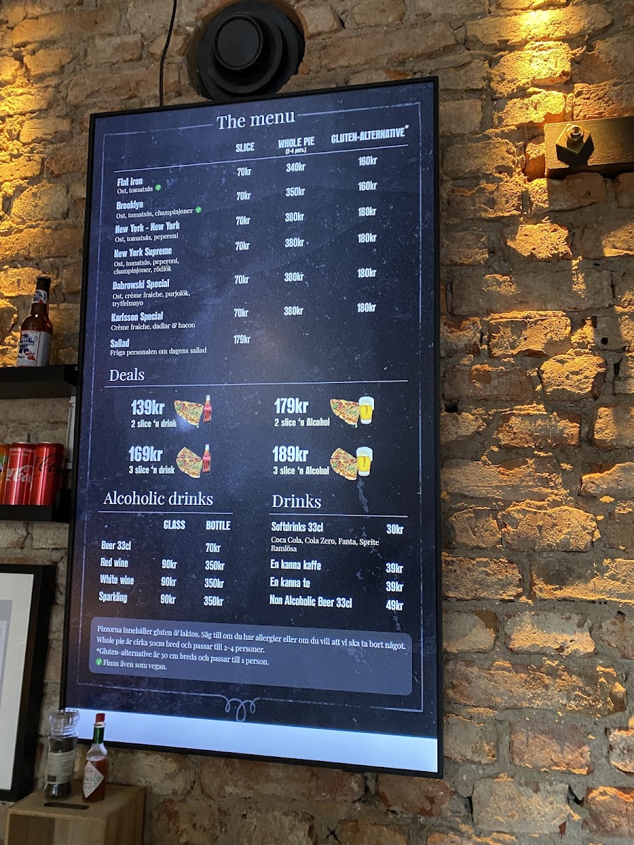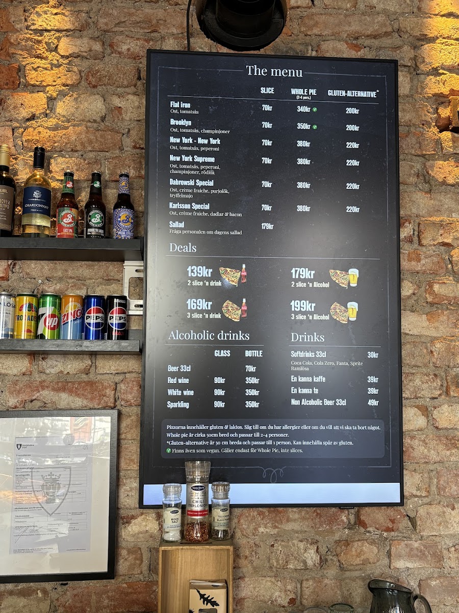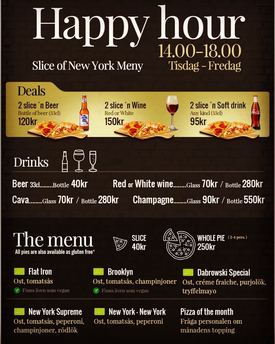 As a reviewer looking back at the menu of Slice Of New York - Pizzeria - Vasastan, it’s clear that this spot stays true to the soul of classic New York-style pizza while still offering enough variety to keep things interesting. The menu may not be overly long, but it feels carefully curated, focusing on quality and familiarity rather than excess. Signature options like Flat Iron, Brooklyn, and New York - New York showcase the restaurant’s commitment to bold flavors, thin crusts, and generous toppings that reflect authentic NYC pizzeria traditions. For those who enjoy more loaded or distinctive combinations, New York Supreme and Dabrowski Special stand out as satisfying, flavor-packed choices that feel hearty without being overwhelming. Overall, the menu delivers exactly what it promises: straightforward, well-executed pizza classics that prioritize taste and consistency, making Slice Of New York - Pizzeria - Vasastan a reliable choice for anyone craving an authentic New York pizza experience in the heart of Stockholm.