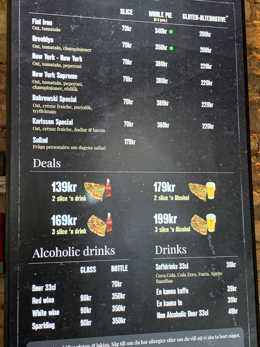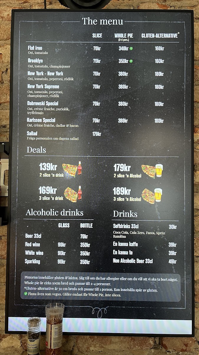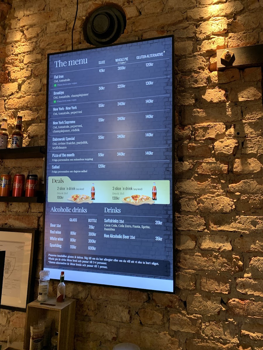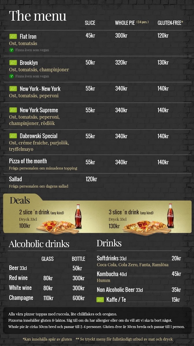 As a reviewer looking back at the menu of Slice Of New York - Pizzeria - Vasastan, it’s clear that this spot stays true to the soul of classic New York-style pizza while still offering enough variety to keep things interesting. The menu may not be overly long, but it feels carefully curated, focusing on quality and familiarity rather than excess. Signature options like Flat Iron, Brooklyn, and New York - New York showcase the restaurant’s commitment to bold flavors, thin crusts, and generous toppings that reflect authentic NYC pizzeria traditions. For those who enjoy more loaded or distinctive combinations, New York Supreme and Dabrowski Special stand out as satisfying, flavor-packed choices that feel hearty without being overwhelming. Overall, the menu delivers exactly what it promises: straightforward, well-executed pizza classics that prioritize taste and consistency, making Slice Of New York - Pizzeria - Vasastan a reliable choice for anyone craving an authentic New York pizza experience in the heart of Stockholm.